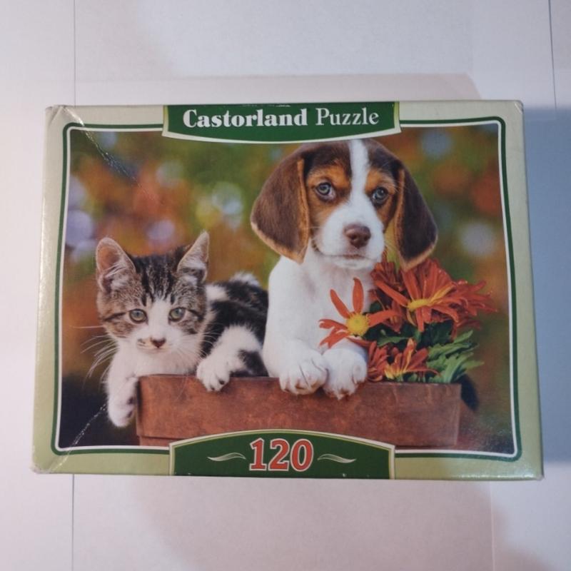 Пазлы с котиком и собачкой. Б/в, в хорошем состоянии,только упаковка чуточку мята,в наличии все 120 элементов цена указана с комиссией шкафа