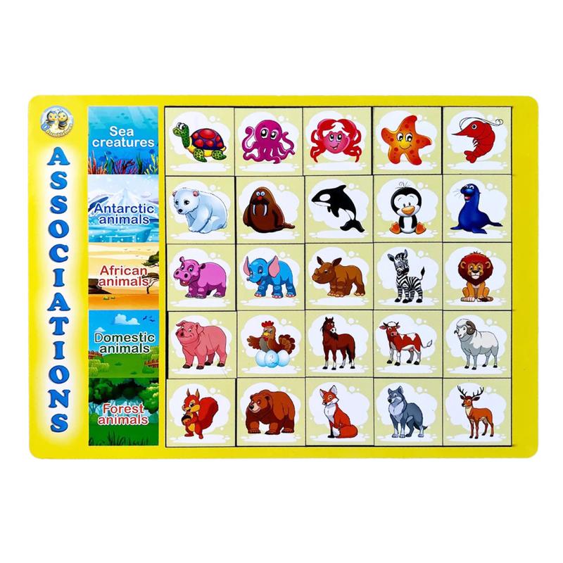 Деревянный планшет-рамка, на котором изображены пять разных картинок окружающей среды животных. Квадраты в ряд (всего 5 рядов – 25 квадратных плашек) с животными. Необходимо правильно отсортировать животных по их среде обитания.