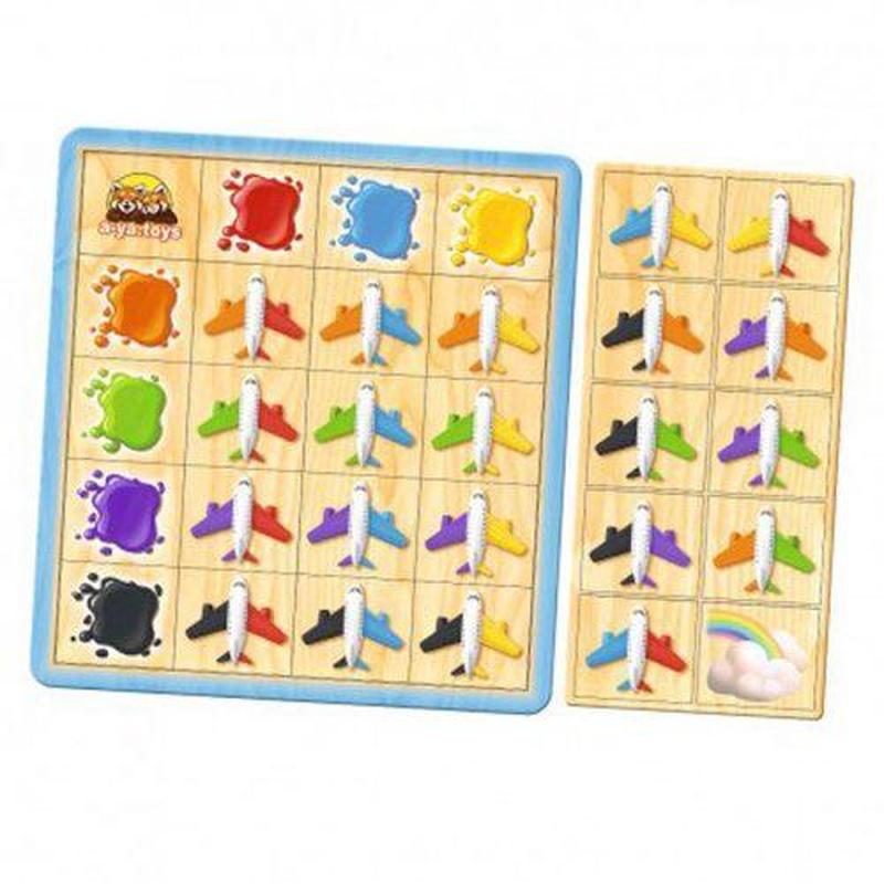 В наборе 30 плашек для сортировки. Как играть: нужно расположить самолеты согласно плашкам с цветами. Слева и сверху находятся плашки, отвечающие за цвет левого и правого крыла самолета. Если малыш расположит цвета так, что нельзя найти нужную плашку, значит самолетик нужно перевернуть (изучение направлений). Если ребенок все поймет правильно, то вручаете ему плашку с радугой._ Бренд: Ubumblebees Язык: Украинский Упаковка: Пленка Цвет: Разноцвет Вес в упаковке: 350 г Габариты в упаковке: 1 x 21 x 23 см Габариты без упаковки: 1 x 21 x 23 см Cтрана производитель: Украина Материал: Дерево Комплектация: 30 плашек, рамка