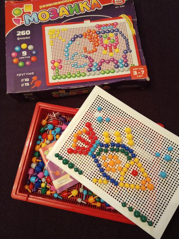 Мозаика для маленьких от 3-х лет 260 (на самом деле около 300) элементов, 9 цветов, два размера: 10 и 15 мм в диаметре. ТМ Play Smart Состояние мазаики как новая, а коробка имеет потертости и вмятин. Размер коробки 32 х 25 Размер поля 27*19.5см Отправка НП, УП