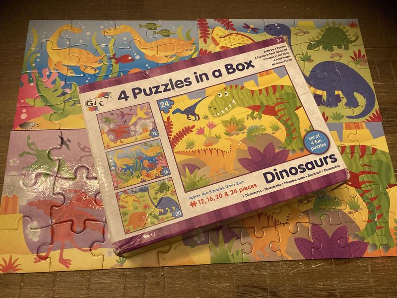 Четыре ярких пазла в коробке. Каждый в сложенном виде имеет размер 15х21 см. Есть следы пользования. Количество 12 - 16 - 20 - 24 штуки