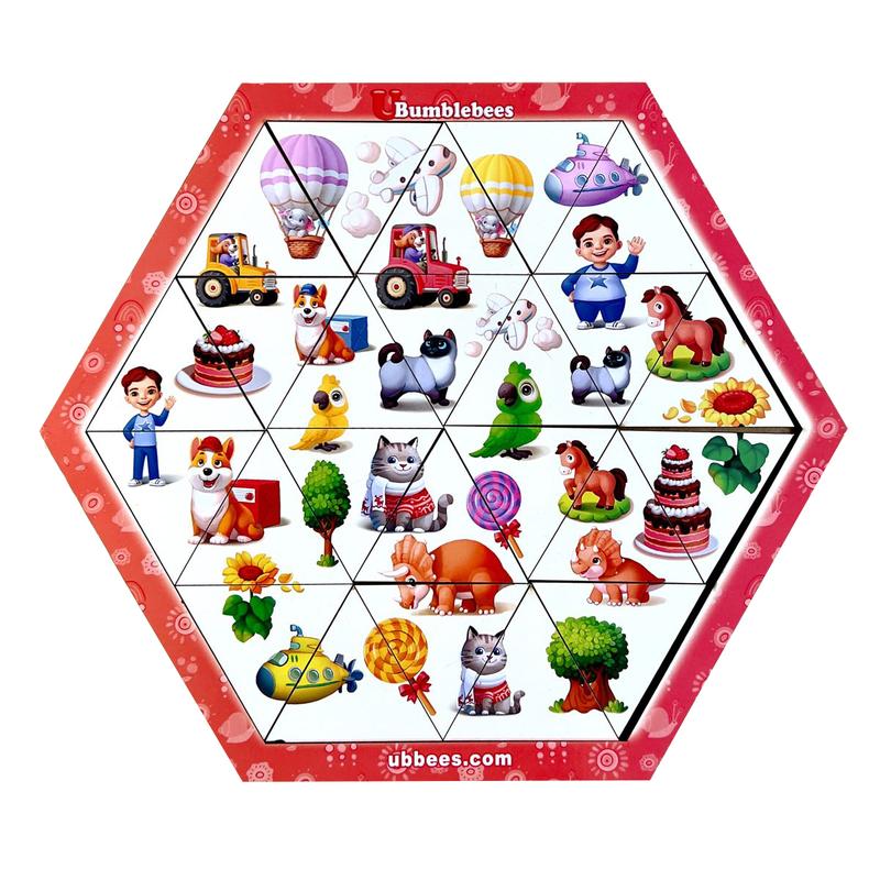 "🔺 Пазл из треугольников – интересная игра для развития мышления! Этот уникальный пазл создан для любителей вызовов и желает развиваться в игре. Его особенность – это треугольные детали, на которых нарисованы половинки изображений разных размеров. 💡 Что делает игру интересной? 🔸 Усложнения для мозгового штурма: каждое изображение имеет пару, но похожие рисунки, такие как худевый и толстый мальчик или большая и маленькая собака, добавляют интриги и заставляют ребенка присмотреться в кратчайшие сроки. 🔸 Изучение понятий: большой/маленький, похожий/разный – малыш учится различать и классифицировать изображения. 🎯 Что развивает эта игра? Логическое мышление – нахождения пар и правильная сборка деталей в одно целое. Исключительное мышление - ребенок изучает концепции размеров и форм. Мелкую моторику – манипуляции с треугольниками тренируют пальчики. Внимание и память – каждая деталь нуждается в концентрации для поиска соответствия. ✨ Этот пазл – отличный выбор для активного обучения через игру! Познайте мир с удовольствием! 😊"