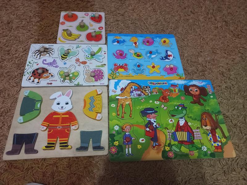5 наборов: фрукты, насекомые, морские животные, заяц с разной одеждой и чебурашка. Из нюансов на чебурашке нет ручки, и порвался рисунок, сама физрука целая, заяц порисован. Состояние всех на фото. Цена за все.