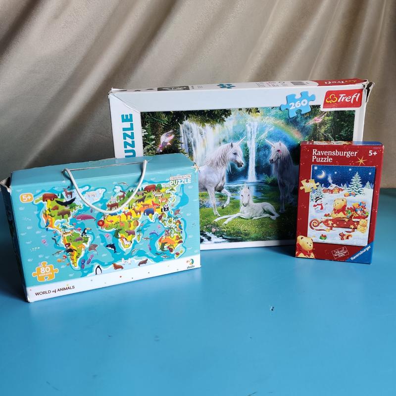 В каждой коробке не хватает по 1-3 детали 1. Пазлы с единорогами Trefl, 260 деталей (не хватает 3 шт) 2. Пазлы "Мир животных" Dodo, 80 деталей (не хватает 1 шт) 3. Пазлы новогодние с мишкой Ravensburger, 99 деталей (не хватает 1 шт) В объявлении присутствуют фотографии коробок и как выглядят сложенные картинки Пазлы с единорогами и медведем в отличном состоянии, с картой - некоторые с дефектами 60 грн за все