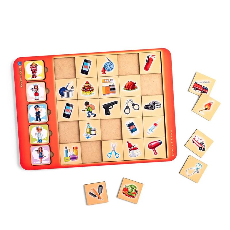 Сортер состоит из планшета с 5 картинками представителей разных профессий и 25 плашек с тематическими предметами, которые малышу нужно подобрать под каждую профессию. Игра хорошо тренирует ассоциативное мышление у детей. Плашки удобно считать и играть ими в "Мемори" или "5-й лишний".