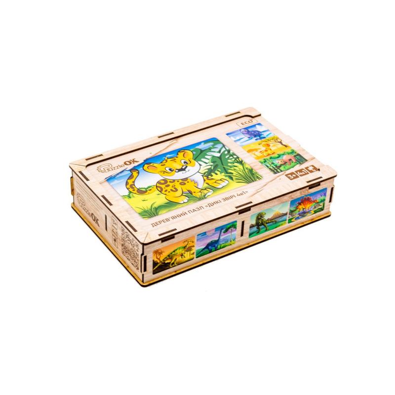 Деревянная развивающая игрушка в виде пазла "Дикие животные 4в1" рекомендована для детей в возрасте от 4 лет или даже меньших. дизайн, углы деталей зашлифованы и не поцарапают кожу ребенка во время игры. Эко-пазл позволяет развивать мелкую моторику, внимательность, память. Играйте вместе с вашим малышом или позвольте ему заниматься самостоятельно или с друзьями.