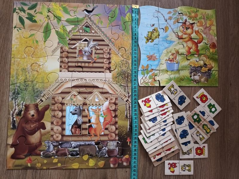 Развивающий набор для детей младшего дошкольного возраста. Картонные пазлы+деревянное домино. Пазлы без дефектов. Домино, как новое. Без коробок. Коробки "соединила" собачья ребенок.