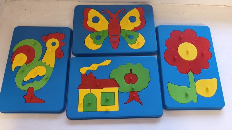 Яркие пластиковые пазлы с ручками для малышей - идеально подходят для развития мелкой моторики, логики и цветоприятия. Прочные, удобные в использовании, легко моются. В наборе 4 картинки: 🐓 петушок 🦋 бабочка 🌸 цветок 🏠 дом с деревом 📏 Размер одной доски: 23×15 см 👶 Возраст: от 1,5 лет Состояние - отличное, все детали на месте!