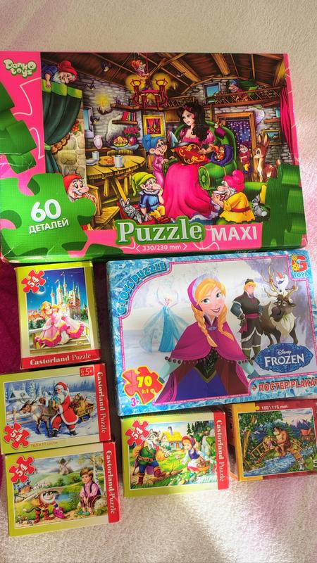 Пазлы разные. Цена указана за все пазлы вместе Спящая красавица и семь гномов Danko toys +5роков. размер 330 * 230. 60 деталей. Frozen disney G-toys +3 роки. крупные детали. Размер 30см*21см 70 деталей. Маленькие пазлики Castorland пять штук пазлы из сказок. Размер 16.5*11 см. по 54 детали.+4-5 лет В одном пазлике маленьком санта с оленем нет одной детали. Сами детали в каждой пазлике чистенькие, непорированные, недеформированные. Цена указана за все пазлики.