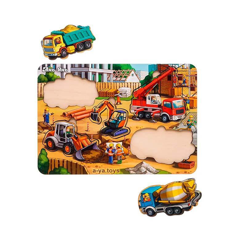 Яркий тематический фон этого сортера детям будет интересно рассматривать и изучать в деталях, а вкладыши строительной техники удобно доставать пальчиками и вкладывать на свои места по форме. Можно также сосчитать технику и поговорить о ее функции в строительстве.
