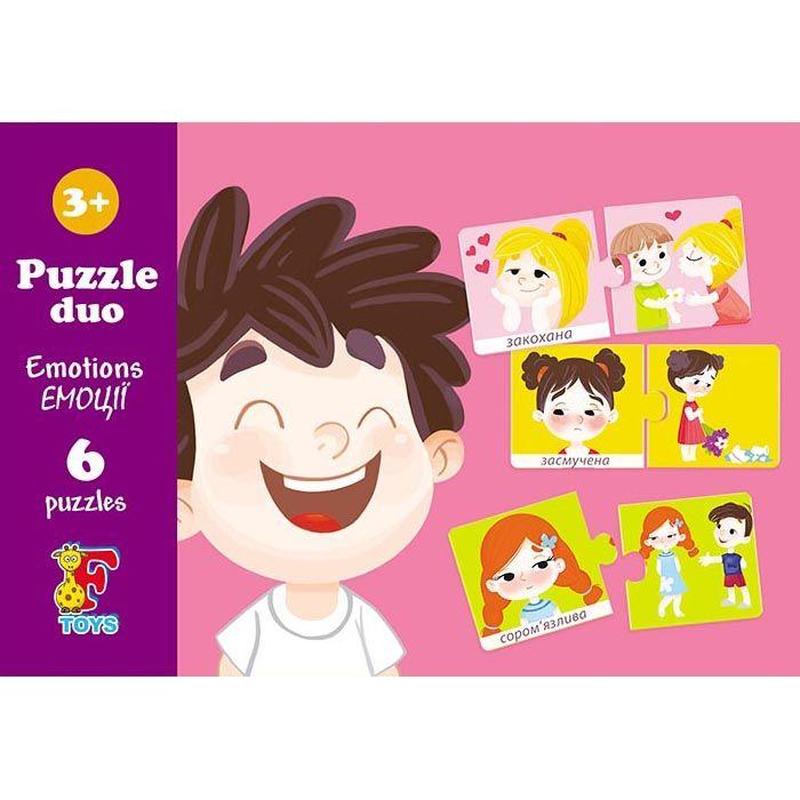 Яскраві та барвисті пазли на 6 елементів. Великі деталі. Розвивають логічне мислення, дрібну моторику рук, посидючість. У наборі пазли з емоціями та відповідними їм картинками. Підходить для дітей віком від 3-х років