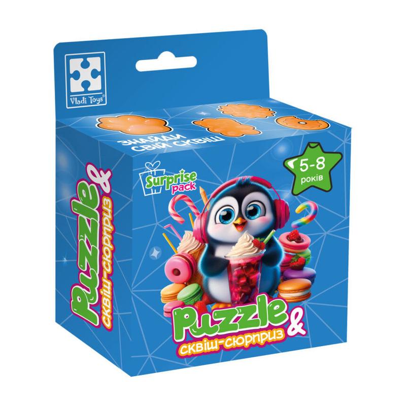 Игра развивающая пазлы с сюрпризом "Пингвинятко" VT8030-06 перенесет ребенка в мир, где волшебный пингвиняток в наушниках лакомится вкусными десертами и молочным коктейлем. Но магия на этом не кончается! Внутри коробки скрывается сквиш-сюрприз – трендовая игрушка, которую обожают дети. Узнай, какой из этих мягких сюрпризов ждет именно тебя. Материал: картон. Возраст: 5-8 лет. Размер пазловой картинки: 22 х 23 см. Комплектация: пазл на 180 деталей, сквиш.