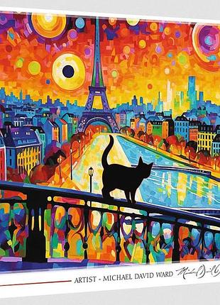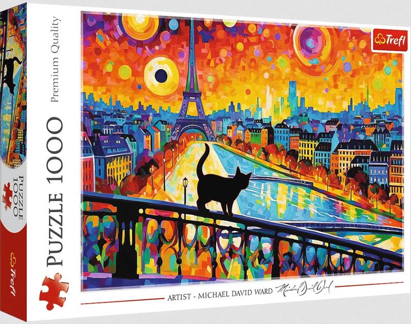 Пазлы 1000 деталей, "Кошка в Париже". После сборки будет создана картинка размером 68 х 48 см. Высокое качество, насыщенность цветов и безопасная сборка обеспечивается каландровой светоотражающей бумагой, покрытой экологичными пищевыми красками.