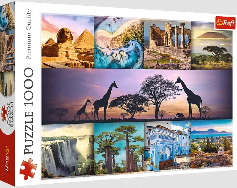 Пазлы 1000 деталей, "Африканский коллаж". После сборки будет создана картинка размером 68 х 48 см. Высокое качество, насыщенность цветов и безопасная сборка обеспечивается каландровой светоотражающей бумагой, покрытой экологичными пищевыми красками.