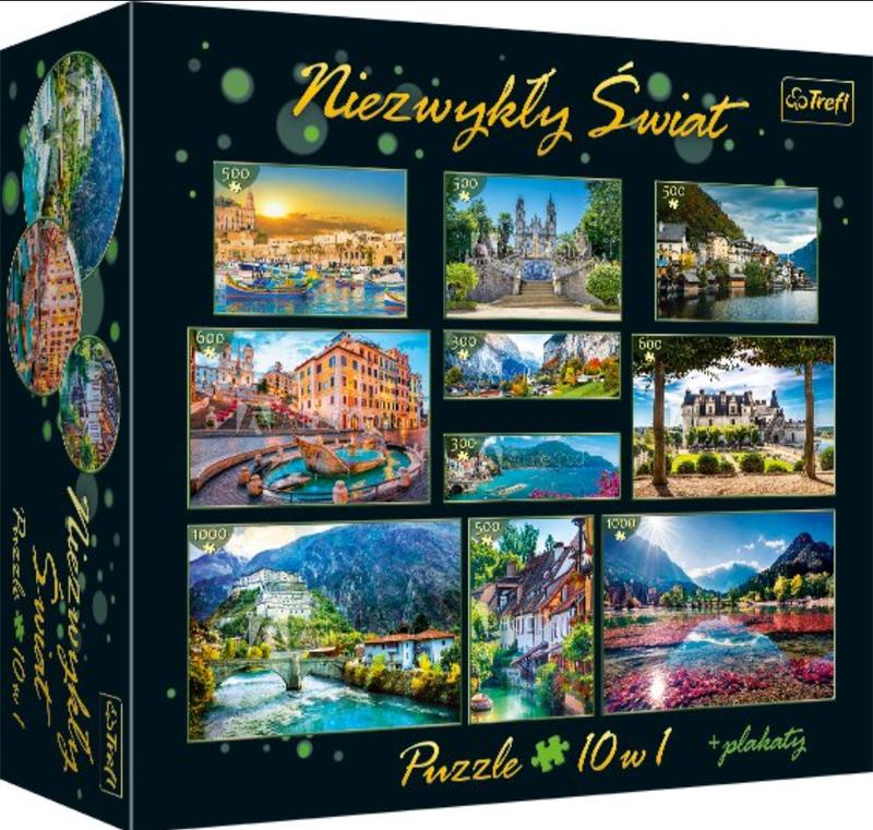 Подарочный набор пазлов "Мультипазлы 10 в 1" состоит из 10 отдельных картинок на 300, 500, 600 или 1000 элементов в одной упаковке с изображениями живописных мест и уголков старой Европы. 300 эл. - долины Лаутербруннен в Швейцарии и городки Атрани в Италии; 500 эл. - города Кольмар во Франции, озера Гальштат в Австрии, рыбацкой деревни Марсашлокк на Мальте и католического Храма в португальском городе Ламего; 600 эл. - испанской лестницы в Риме и средневекового замка Амбуаз во Франции; 1000 эл. - озера Ясна в Словении и форт Бард в Италии. После укладки пазлов мы получим 10 разных картинок размером от 60х40 см до 68х48 см в зависимости от количества элементов. Набор, в состав которого входят еще и тематические плакаты, станет отличным подарком как для отдельной семьи, так и для небольшой компании, ведь данные картинки можно собирать как поочередно, помогая друг другу, так и одновременно, устроив небольшое соревнование, когда каждый участник отдельно наперегонки собирает свое любимое изображение. Высокое качество, насыщенность цветов и безопасность при укладке пазлов обеспечивает специальный картон, отражающий свет и покрытый экологичными красками, а стильная упаковка придает этому набору презентабельности и делает его идеальным подарком. Предупреждение! Не предназначены для детей младше 3-х лет. Продукция содержит мельчайшие детали. Чтобы избежать опасности (проглатывание деталей, попадание в носовые или слуховые отверстия), рекомендуется использовать под наблюдением взрослых.