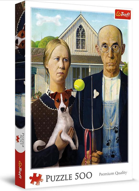 Пазл 500 деталей "Американская готика" 37526 отдельное издание с собакой представляет веселую версию карты Гранта Воде. После сборки будет создана картинка размером 48х34 см. Высокое качество, насыщенность цвета и безопасная сборка обеспечивается каландровой светоотражающей бумагой, покрытой экологичными пищевыми красками.