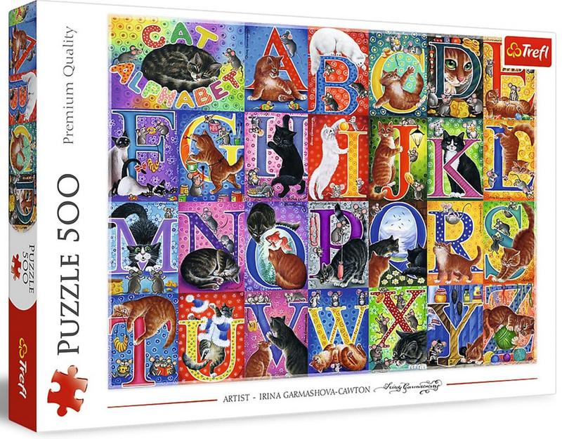 Пазл 500 деталей "Кошачий алфавит". После сборки будет создана картинка размером 48х34 см. Высокое качество, насыщенность цвета и безопасная сборка обеспечивается каландровой светоотражающей бумагой, покрытой экологичными пищевыми красками.