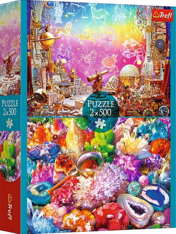 Пазл Космос и кристаллы 2х500 -- это два пазла по 500 деталей в одной упаковке! Космос и кристаллы -- головоломка, изображающая волшебную обсерваторию и разноцветные камни. Каждый пазл позволит вам создать картинку размером 480х340 мм. Пазлы изготовлены в Польше из высококачественных материалов и с заботой об окружающей среде. Пазл покрыт специальной каландрированной бумагой, которая отражает свет, что облегчает его сборку.