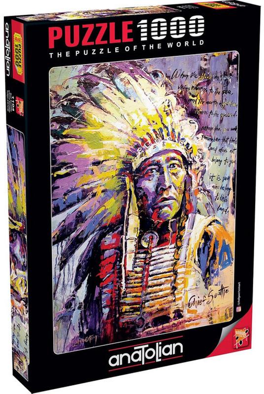 Пазл состоит из 1000 деталей, "Вождь Сиэтл". После сборки будет создано изображение размером 660x480 мм. Anatolian Puzzle - это веселая деятельность, которой можно заниматься в одиночку или в группе. Это отличный подарок для всех возрастов на дни рождения, праздники и особые события. Благодаря входящей в комплект картонной подставке вы можете разместить крышку визуальной коробки вертикально/горизонтально. Яркие цветные изображения, наклеенные на плотный специальный голубой картон для пазлов, вырезаны специальным инструментом для вырубки ручной работы. Благодаря высококачественным материалам и технологиям, используемым в производстве продукции, изделия имеют антибликовую поверхность.