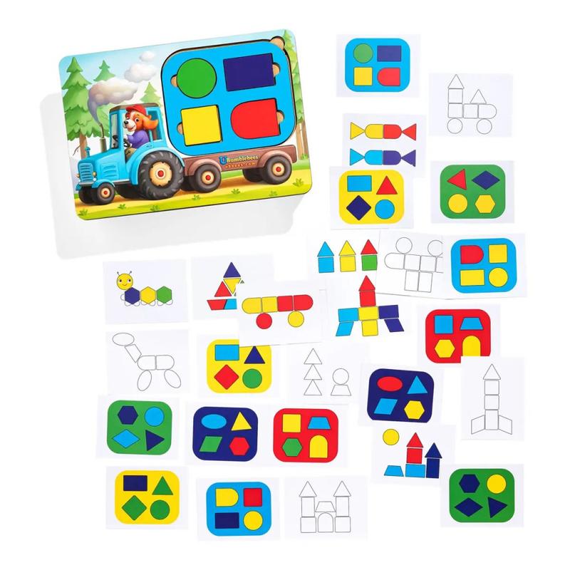 Развивающая игра в виде трактора, который собрал урожай из разных фигур. Кузов трактора - это сменные основы 5-ти цветов. Малышу необходимо вставить разноцветные фигуры в основу нужного цвета по подобию. Также из фигур можно выложить много разных узоров, персонажей, абстракций. Эта игра - отличный помощник в изучении фигур, счета и цветов. Предложите ребенку придумать для тракториста имя и тогда играть станет еще интереснее.