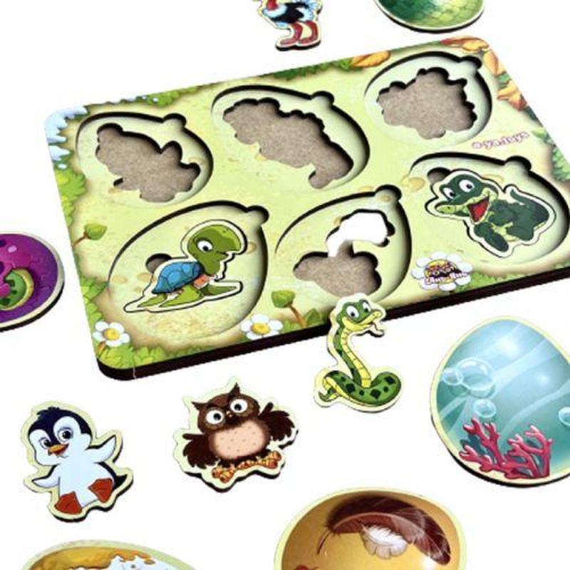 Деревянная рамка-пазл "Кто в яйце?". Нижний слой с картинками разных животных и птиц, верхний - разноцветные яйца. Вкладыш нужно сложить по принципу пазла и установить в рамке. Размер рамки - 16х23 см._ Бренд: Ubee Упаковка: Пленка Цвет: Разноцвет Вес в упаковке: 290 г Габариты в упаковке: 1 x 16 x 23 см Cтрана производитель: Украина Материал: Дерево Комплектация: Пазл-сортер