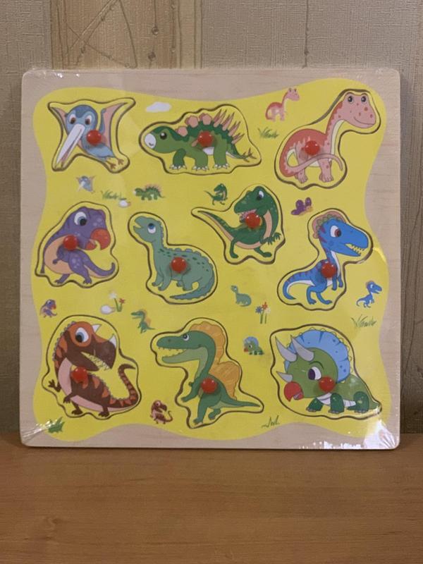 Пазлы вкладыши деревянные. Развивающая игрушка - яркие пазлики с весёлыми динозавриками. На каждой фигурке есть удобный держатель, за который ребёнку будет их удобно вынимать и вкладывать. Предназначены для деток от 1 года. Размер планшета: 22*22 см. Игрушка новая.
