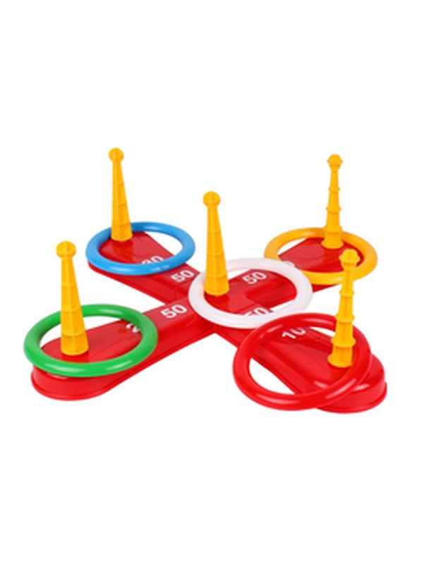 «Кольцекид» интересная игрушка для активного отдыха детей и взрослых. Собрав 2 и более команды игроков, можно устроить соревнование. Такие активные игры тренируют у детей мелкую моторику, ловкость и меткость, воспитывают лидирующие качества и целеустремленность. Перед началом игры необходимо собрать крестообразную основу и вставить в отверстия стержня, на которые набрасывают кольца. Числа 10,20,30,50 возле каждого стержня - количество баллов, набирающих игрок при накидании кольца на соответствующий стержень. Победителем становится тот, кто набирает большее количество баллов. В наборе: крестообразная основа из двух частей, стержни и кольца по 5 шт. Производитель: Украина