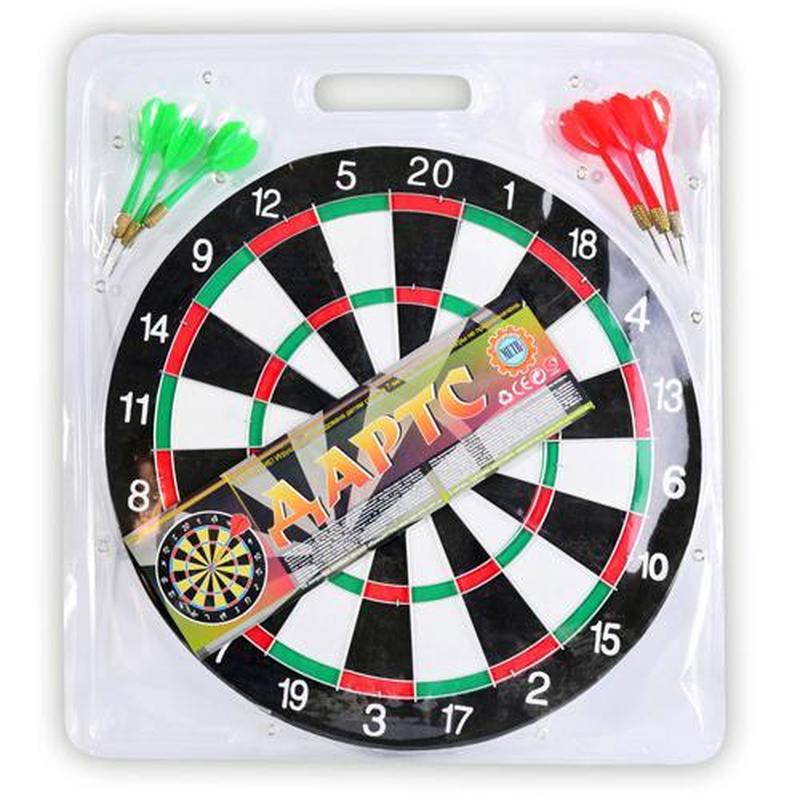 Спортивна гра "Дартс". Матеріал - алюміній, рослине волокно. Розмір - 15 дюймів (38 см). Комплектація - мішень, 6 дротиків. Вага - 945 грамів. Упаковка - слюда. Розмір - 40,5х44 см.