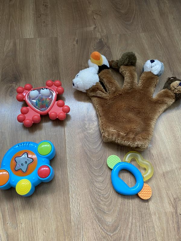 Игрушки в отличном состоянии, качество💣. Голубой барабанчик с батарейками, при нажатии издает различные звуки, красный крабик-погремушка крутится как зигга, перчатка кукольный театр для малышей очень увлекательная игрушка. Барабанчик продано.