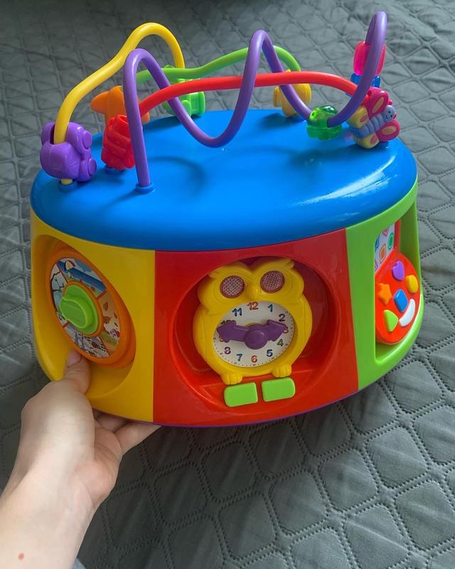 Ігровий центр Kiddieland із звуковим супровідом українською мовою. Справжній Мультицентр для навчання та гри. Центр круглої форми, розділений на шість секторів, кожен з яких навчить малюка чомусь новому, а зверху лабіринт з намистинками і маленькими фігурками - потяг, метелики, машинки, тваринки. Сектора різних кольорів з кнопочками, видають звуки і світяться. Граючи з цим чудовим Мультицентр, Ваша дитина познайомиться з совою-годинником і розкладом дня, різними музичними інструментами, комп'ютером з геометричними формами, вивчить 3 народних пісеньки і кілька віршиків. Джерело: https://bi.ua/ukr/product/igrovoy-centr-multicentr-kiddieland-na-ukrainskom-yazyke-54932.html © Будинок Іграшок
