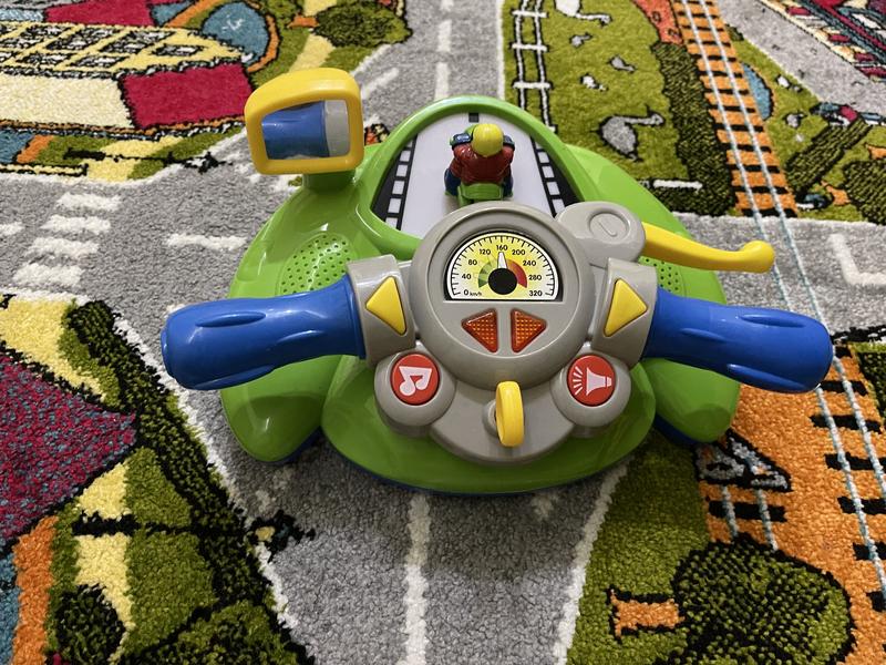 В идеальном состоянии. Все кнопки работают. Ребёнок играл пару раз. Особую радость доставляют ребенку различные эффекты: светящиеся лампочки, характерный звук поворотов, мелодии, звуковые сигналы. Игрушка имитирует катание на мотоцикле, и ваш малыш сможет ощутить себя настоящим гонщиком, переключать скорости, включать поворотный сигнал, поворачивать боковое зеркало с помощью кнопки. Руль отлично тренирует внимание, мелкую моторику рук, знакомит ребенка с понятием “влево” и “вправо” . Смотрите другие мои объявления, есть много интересного.