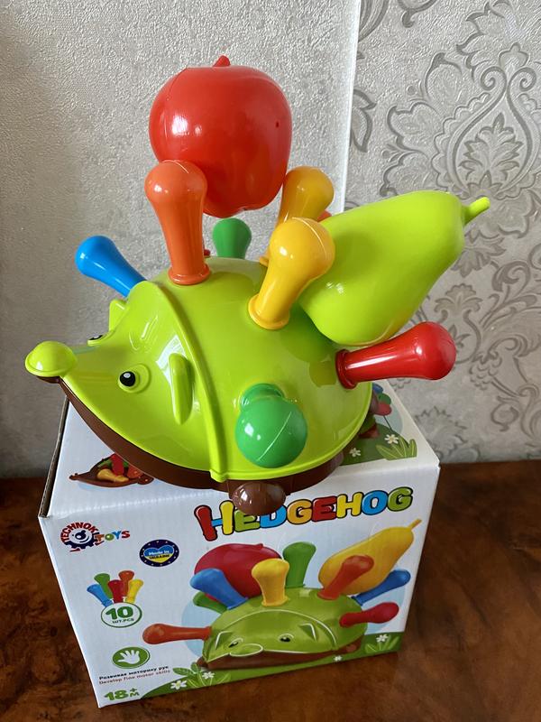 Іграшка дитяча Їжачок - розвиваючий сортер , упаковка - коробка. На спині їжачка є 10 отворів, в які необхідно вставити різнокольорові "голки". Також в комплекті яблуко і груша. Іграшка оснащена 4-ма колесами, на носі є отвір для мотузки (можна використовувати як каталку). Іграшка виконана з високоякісного пластику, не містить шкідливих речовин. Розмір упаковки 19-10,5-15 см