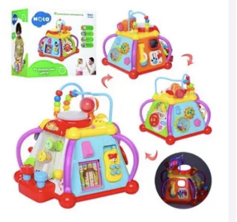 Характеристики развивающей игрушки-сортера Мультибокс 806: Игрушка выполнена в виде пятигранной пирамиды с различными развивающими элементами и включает 15 игр. На первой грани пирамиды находится детский съемный сотовый телефон-пищалка с нажимающимися 4-мя кнопками с цифрами на них, что позволит учиться счету от 1 до 4, и окошко со звонком, при нажатии на который в окошке меняются картинки и сопровождающие их звуки. Вторая сторона игрушки выполнена в виде панели машины, на которой размещен ключ зажигания, руль с сигналом (издают соответствующие звуки) и игрушечная маленькая машинка, которая двигается влево-вправо в зависимости от движения руля. На третьей стороне пирамиды находятся 2 колесика-шестеренки, при вращении которых раздается мелодия. Для выбора мелодии используется кнопка над колесиками, а для остановки мелодии, кнопка размещенная под шестеренками. На четверной стороне размещен микрофон для караоке (усиливает звуки) и зеркальце, которое «превращается» в игрушечный телевизор, поднятием выключателя снизу. На пятой стороне находятся «стучалки» с молотком. С помощью молоточка, который находится в пазе на верхней панели игрового центра, ребенок бьет по 2-м разноцветным кнопкам-грибочкам, в результате в пластиковой прозрачной трубке взлетает шарик. В верхней части игрушки размещена прозрачная кнопка-барабан, мигающая при нажатии и издающая забавные звуки, и счеты-лабиринт с разноцветными бусинками. Материал: высококачественный пластик. Питание: 3 батарейки типа АА (в комплект не входят). Размер упаковки: 30х28х18 см.