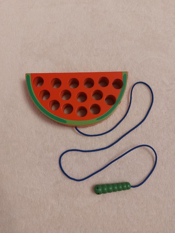 Деревянная шнуровка в виде дольки 🍉 и червячка на шнурке. Малышу нужно наловчиться попадать в дырочки, удерживая образного червяка с обратной стороны. Тренирует ловкость рук и мелкую моторику. Есть небольшой нюанс на одной стороне, потёртость краски( 4 фото). Цена с учётом этого 99 гр.