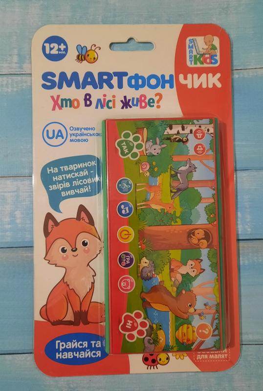 Телефончик навчальний "Хто живе в лісі?", на українській мові. Має такі функції: - гра відгадай-ка (послухай загадку відгадай звірятко 39 загадок); - 3 веселі пісні; - гра-вікторина "Так чи Ні" 86 питань з хитринкою; - назви та голоси тварин (10 віршиків). Для роботи потрібно три батарейки типу ААА (в комплект не входять).