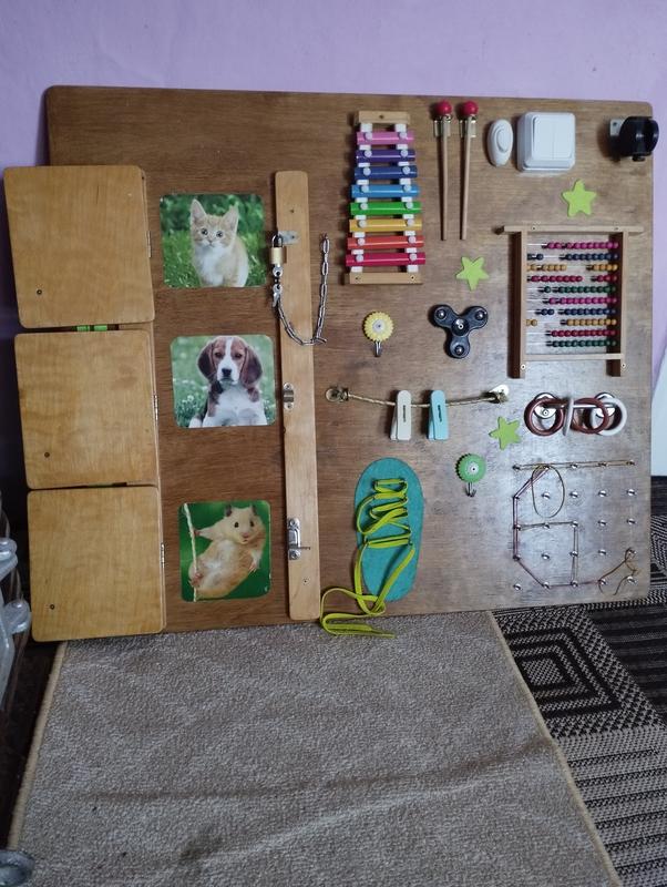 Великий і дуже цікавий бизиборд. Розміри 66*76 див. Дуже якісна ручна робота. За основу взяті екологічно чисті матеріали(березова фанера покрита безпечним акриловим лаком на водній основі).Всі деталі надійно кріпиться на саморізи.