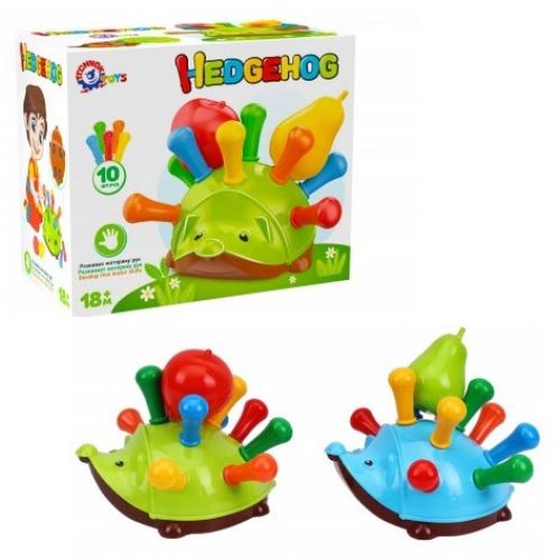 Іграшка для дітей від 1-1,5 років. Комплектація: їжак, 10 голок, яблуко, груша. Пакування: кольорова коробка (19х11х16 см) колір їжачка блакитний. Голки різних класичних кольорів підходять також для завдань з вивчення кольорів, сортування, лічби, додавання та віднімання. Їжачок обладнаний 4-а маневровими колесами, а на носику є спеціальний отвір для мотузки. Сортер стає цікавою каталкою, його можна возити вдома, чи брати на прогулянку.