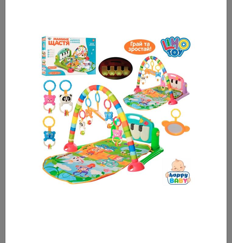 Развивающий коврик с 0 Пианино имеет 4 больших клавиши, кнопки с детским голосом и смехом, кнопку для воспроизведения детских песен. Три режима работы и 10 веселых песен.
