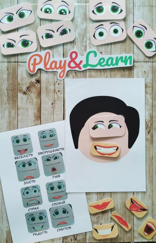 При заказе указано: девочка или мальчик. 14 деталей на липучках (8 пар глаз, 6 ротиков). В набор входит подсказка. Можно сложить больше эмоций, чем в подсказке.