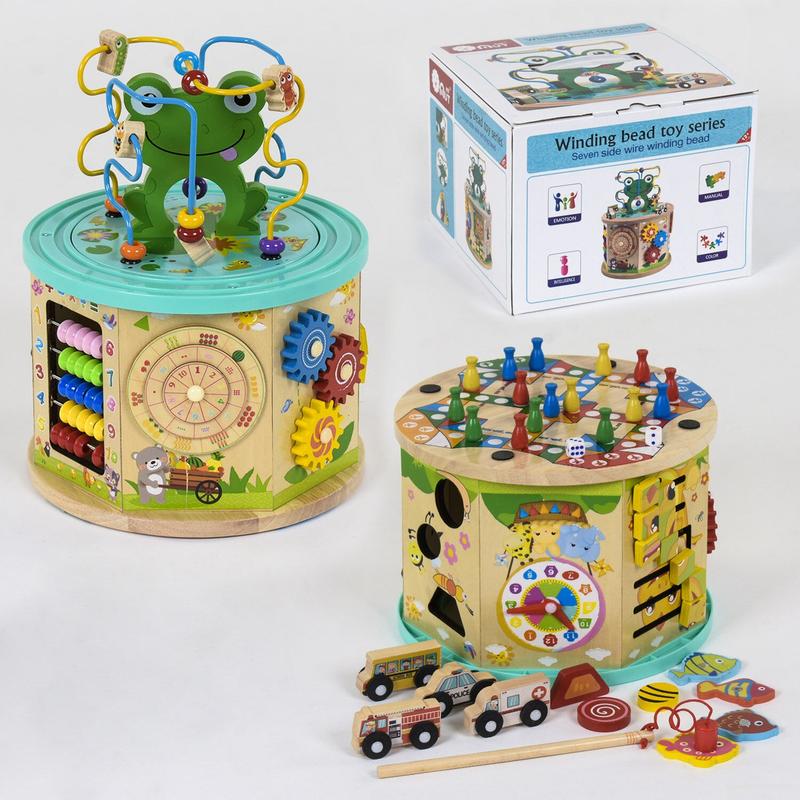 Весь асортимент дитячих товарів та іграшок дивіться за посиланням barbaris.******* Розмір/габарити: 24 см × 24 см × 31 см Розмір упаковки: 24 см × 25 см × 19 см Паковання: Коробка Для дітей: від 1 року Дерев'яний логічний центр C 39192 — універсальна розвивальна іграшка. На всіх гранях куба встановлені оригінальні ігрові панелі, кожна з яких спрямована на розвиток певних навичок дитини. Функціональні панелі обладнані різноманітними кольоровими рухомими елементами, отворами та іншими цікавими деталями. Багатофункціональна іграшка містить: • пальчиковий лабіринт (зігнутих переплетених дротів, на які нанизані намистинки); • сортер; • дерев'яний лабіринт-пазл; • циферблат годинника з обертовими стрілками; • обертові шестерні; • кільця, що обертається, із зображенням цифр; • рахівниця. За допомогою цього куба малюк навчиться співвідносити кольори та форми, а також тренувати дрібну моторику рук, сенсорику та логічне мислення. Завдяки грі, ранній розвиток малюка відбуватиметься набагато яскравіше та швидше, ніж у його однолітків, а ще з ним просто дуже весело та цікаво грати. * Характеристики та комплектація товару можуть змінюватися виробником без повідомлення