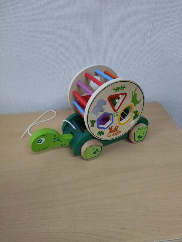 деревянная каталочка сортер Улитка Playtive.Древяная игрушка сочетает в себе два вида каталку и сортер. Каталка в виде улитки на колесиках со шнурком, а по бокам барабана расположены отверстия для различных геометрических фигур-сортер. Малыш может за веревку возить ее за собой, развивая навыки ходьбы, координацию и устойчивость у детей, которые уже научились ходить или только начали заниматься попытками. Развивающая игрушка помогает тренировать мелкую моторику, внимание, логику. Ребенок будет обучать формы, цвета, подбирая для деталей необходимые отверстия