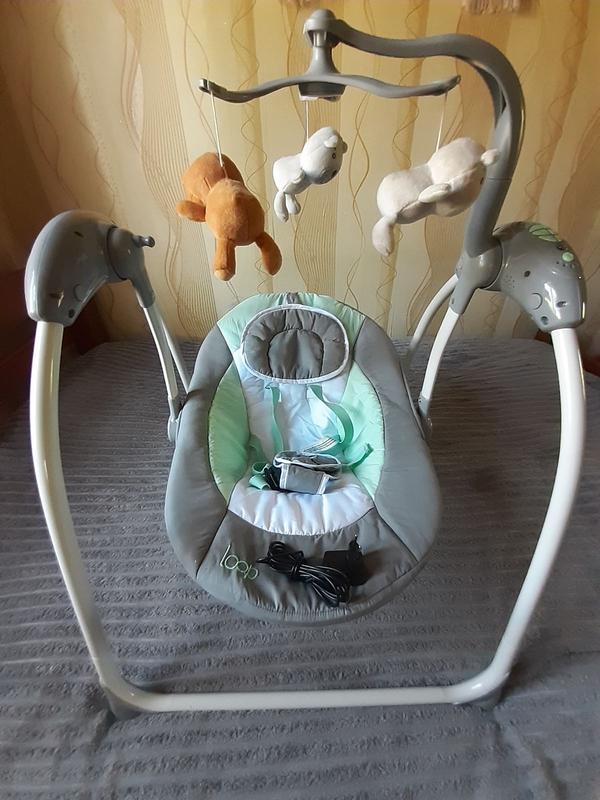Укачивающий центр. Стан - идеальный. Использовать можно с рождения малыша. Максимальна нагрузка 12-15 кг. Работает от сети. Имеет 8 скоростей закачки, спинка регулируется в 3 положения, музыка, звуки природы, регулятор звука, подвесные игрушки.
