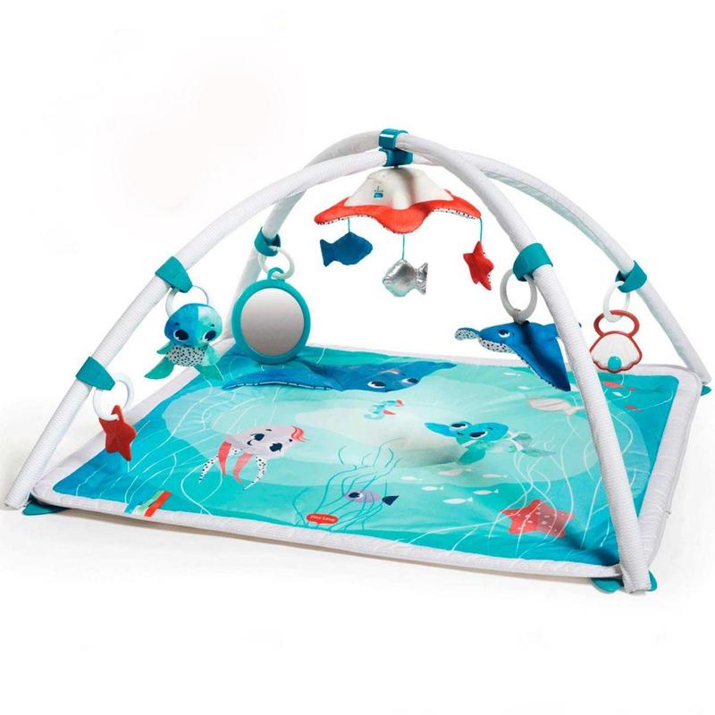 Развивающий коврик с дугами Tiny Love Океан - подарит малышу комфорт и безопасность во время игры, а также обеспечит активное моторное развитие и понимание причинно-следственных связей. Коврик позволяет малышу контролировать и развивать движения своего тела, тренировать координацию, равновесие и осанку. Характеристики: - предназначен для детей от рождения; - выполнен из качественных и безопасных материалов; - две дуги, которые можно отрегулировать различными способами или снять; - скользящие кольца для облегчения перемещения игрушек по дугам; - музыкальная карусель в форме морской звезды с игрушками в виде рыбок и звездочки; - карусель проигрывает 6 мелодий и имеет световые эффекты; - карусель крепится к дугам, ее можно отсоединить и превратить в интерактивную панель; - безопасное детское зеркало; - подвеска в виде ската с колокольчиком и шуршащими плавниками; - погремушка в виде морской черепахи с панцирем из мягкого материала; - прорезыватель в форме морской звезды; - прозрачная погремушка в виде ракушки; - на коврике расположен скат с шуршащим плавником, под которым прячется рыбка, подходит для игры в прятки; - блестящие атласные ленточки; - допускается машинная стирка в деликатном режиме