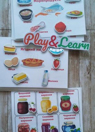 Лепбук складається з 10 ігор: - Молочні продукти - Морепродукти - Борошняні вироби - М'ясопродукти - Ягідний пиріг - Салат - Борщ - Соки - Каші та супи - Варення