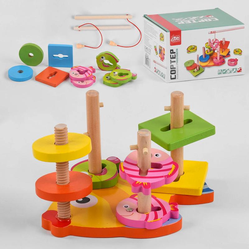 Дерев'яна розвиваюча іграшка сортер пірамідка з магнітною рибалкою
