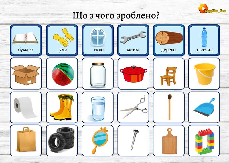 Ребёнок благодаря этой игре будет знать, что из чего сделано. Во первых - это безопасность ребенка: стакан сделан из стекла, которое бьется при сильном ударе и может причинить вред. Во-вторых - ребенку будет интересно узнать свойства предметов. К примеру: ✔ Бумага размокает в воде. ✔ Резина, дерево и пластик не тонет в воде. ✔Стекло и металл тонет в воде. ✔ Бумага горит очень быстро. ✔ Дерево горит медленнее бумаги. ✔ Стекло и металл в привычных условиях не горят. Они могут только плавиться при очень больших температурах на особых производствах. ✔ Резина и пластик курить не рекомендуется, потому что это очень опасно для окружающей среды. Игра на липучках способствует: - Развития речи, логики, мышления - Развитие мелкой моторики Размер игры А4, игра сделана из фотобумаги плотностью 220 г, заламинирована пленкой плотностью 175 мг, липучки круглые размером 15 мм. Количество съемных деталей: 18 шт. Язык: русский, украинский Рекомендуемый возраст: с 3 лет ⇩ Для перехода на наш сайт, кликните сюда ⇩
