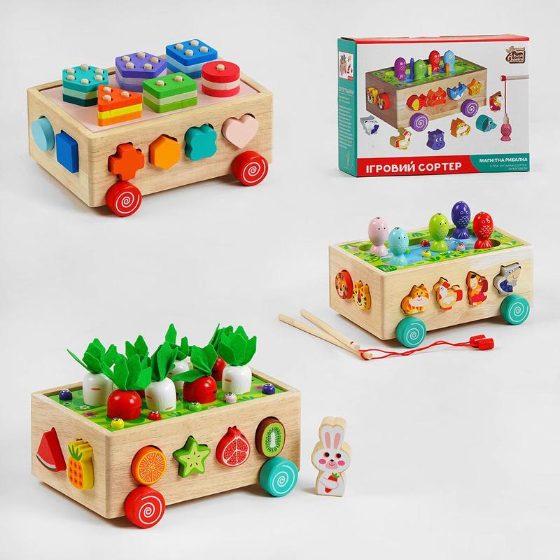 Игровой сортер от "4FUN Game Club wood" представлен в 3-х видах, которые отличаются друг от друга наполнением и тематикой. Боковые стороны игровой платформы - это интересный сортер, который научит ребенка сравнивать и группировать предметы по разным признакам, выбирать правильные силуэты, которые соответствуют определенным игровым элементам. Верхняя часть каталки представлена в нескольких вариантах, среди которых магнитная рыбалка, красочная грядка с сочными морковками или геометрический сортер-пирамидка. Выбирайте вариант игры, который больше всего пришелся по вкусу и обеспечьте малышу интересный и полезный досуг. Особенности: - одна игровая платформа сочетает в себе сразу несколько вариантов игры; - каталка оснащена колесиками; - игра развивает логическое и пространственное мышление, способствует развитию мелкой моторики и координации движений, знакомит с цветами и формами, учит сравнивать и группировать предметы по разным признакам; - все элементы игрушки тщательно проработаны и имеют закругленные края; - игрушка изготовлена из экологически чистых материалов; - детали покрыты устойчивыми и безопасными красками на водной основе. Размер упаковки: 22 х 9 х 17 см Упаковка: Коробка Внимание. Производитель оставляет за собой право изменять комплектацию, цветовую гамму и характеристики товара без предварительного уведомления. После оформления заказа мы свяжемся с Вами в течение 2-х часов и если у Вас возникнут вопросы, мы с радостью на них ответим.