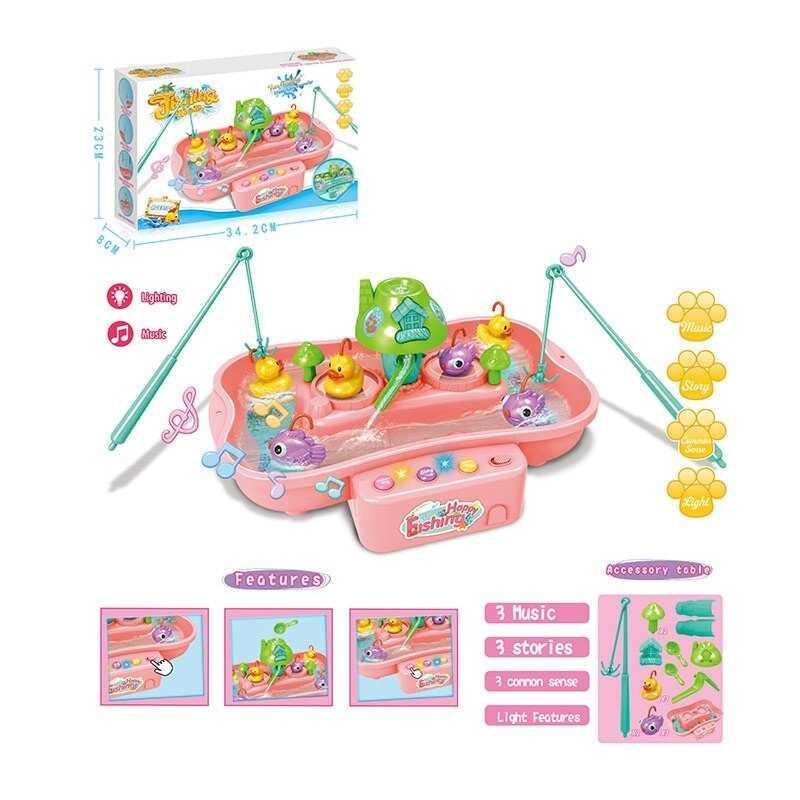 Ігровий набір Риболовля, QY999. Особливості: - На корпусі іграшки розташовані 3 кнопки, натискання на які активує веселі мелодії; - кольорове підсвічування; - автоматичний повітряний потік задає напрямок руху води в резервуарі; - Набір містить 6 фігурок: 3 качки та 3 рибки; - у комплекті представлені 2 вудки з гачками; - набір доповнений ложечкою для води та лійкою; - приємна кольорова гама.