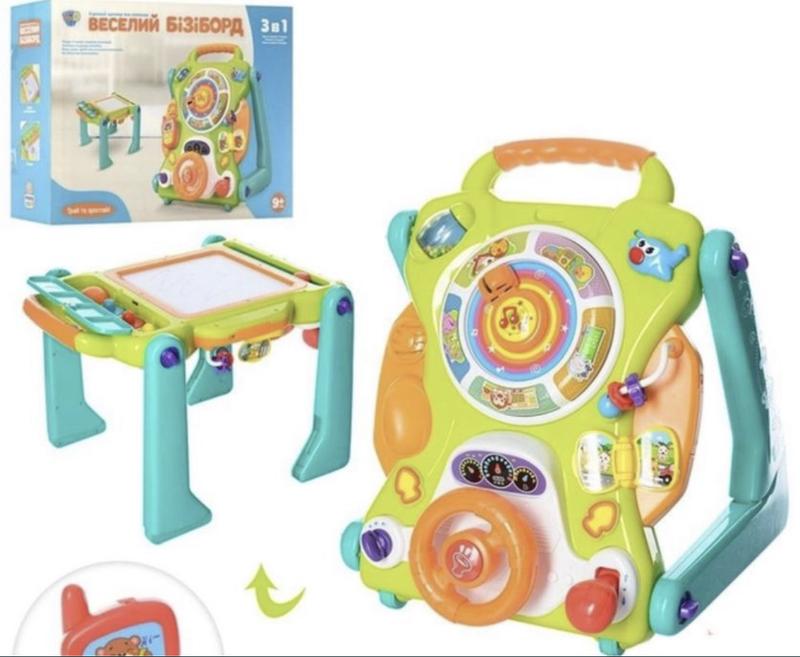 Очень классная игрушка. Можно использовать при первых шагах в качестве сопротивления для малыша. Затем сделать как столик. Есть панель для рисования, в наличии ручка и 3 фигурки, с помощью которых ребенок может изучать цвета и геометрические фигуры. Очень любили эту игрушку. Есть нюанс, нет магнитного телефона. Новая такая каталка стоит 2200. Есть коробка.
