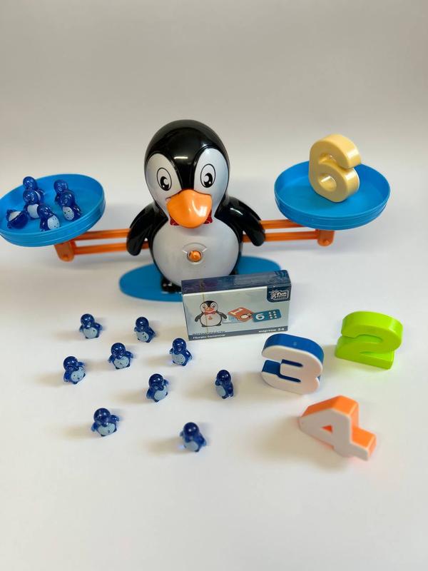 Математическая Игра-балансир 3 уровня игры; каждая следующая цифра имеет больший вес предыдущей; 30 двусторонних карточек; интерактивное обучение; легкое изучение арифметики. Практикуйте математические знания в качестве интересной игры. Наглядно развивайте умение считать, балансируя цифрами и фигурками. В процессе игры ребенок будет развивать мышление, воображение, координацию и моторику рук, а также концентрацию внимания. Всего есть три уровня игры, которые соответствуют цвету карты. Комплектация игрового набора: пингвин с двумя чашами и основанием; 54 двусторонние карты; 19 пинговнятий; цифры от 1-10.